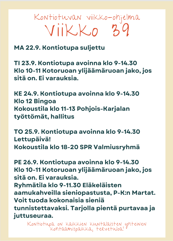 TI 23.9. Kontiotupa avoinna klo 9-14.30