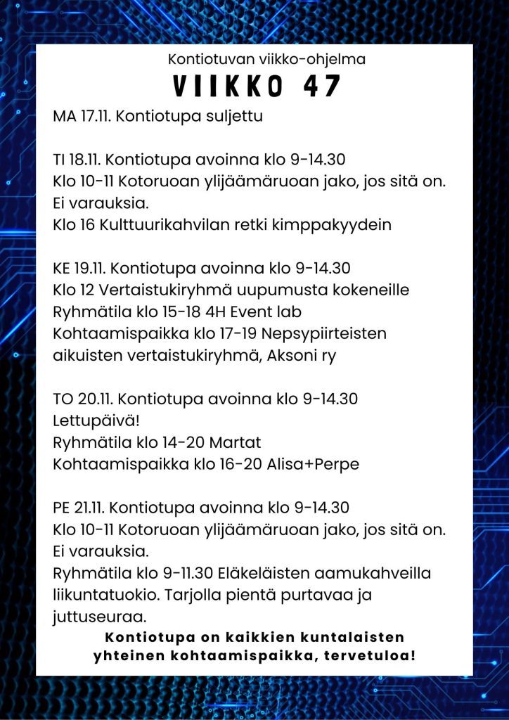 PE 21.11. Kontiotupa avoinna klo 9-14.30